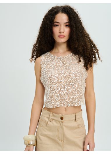 κατασκευάζεται από premium διχτυωτό ύφασμα ,με χειροποίητη ραφή. Cropped top με λεπτομέρειες λάμψης και πέρλες.