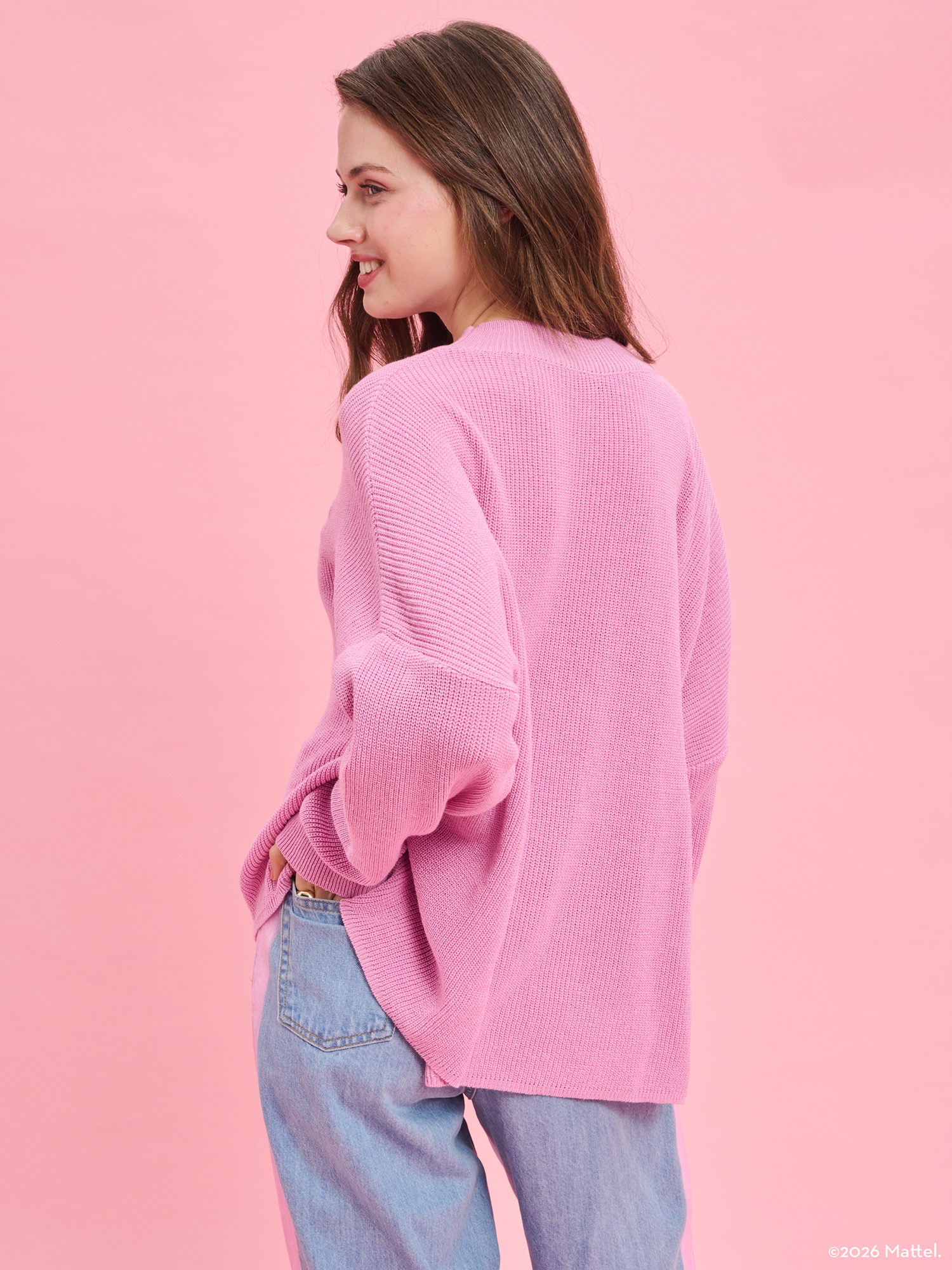 Το Barbie X PROJECT SOMA Becoming Pink Sweater κατασκευάζεται από απαλό, πλεκτό νήμα.Oversized πουλόβερ με ιδιαίτερη λαιμόκοψη και κέντημα στο στήθος.