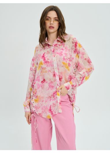 κατασκευάζεται από silky touch αέρινη μουσελίνα με ιδιαίτερο τύπωμα βουκαμβίλιας. Oversized πουκάμισο σε φαρδιά γραμμή με ανοίγματα και δέσιμο στo πλάι.