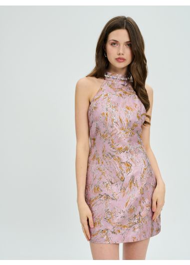 κατασκευάζεται από premium μπροκάρ ύφασμα με λεπτομέρειες λάμψης. Mini φόρεμα με ανοιχτή πλάτη και διακοσμητικά strass.