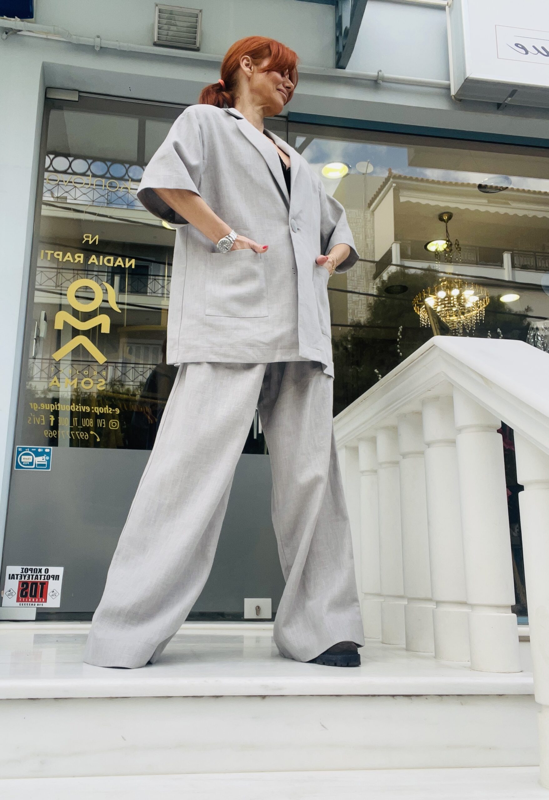 Effortless and polished, these ckontova wide-leg pants are tailored with a high-rise waist and soft front pleats for a flattering, elongated silhouette. Cut in a lightweight, linen-like fabric with a natural texture, they drape beautifully while staying breathable, perfect for warm-weather dressing. Finished with side pockets and a clean waistband, they pair seamlessly with the matching top or blazer for a refined co-ord set, or with a simple tank for everyday chic.