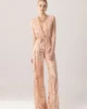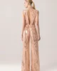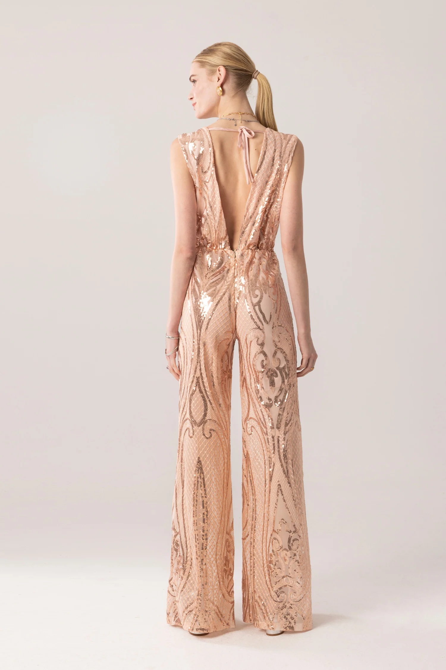 Ολόσωμη φόρμα σε nude βάση με εντυπωσιακά μοτίβα από rose gold παγιέτες που δημιουργούν ένα λαμπερό, πολυτελές αποτέλεσμα. Διαθέτει βαθύ V ντεκολτέ και ανοιχτή πλάτη με διακριτικό δέσιμο στον λαιμό, αναδεικνύοντας τη θηλυκή σιλουέτα. Η ψηλόμεση γραμμή και το φαρδύ, μακρύ παντελόνι χαρίζουν κομψότητα και κίνηση, καθιστώντας την ιδανική επιλογή για βραδινές εμφανίσεις και ιδιαίτερες περιστάσεις.