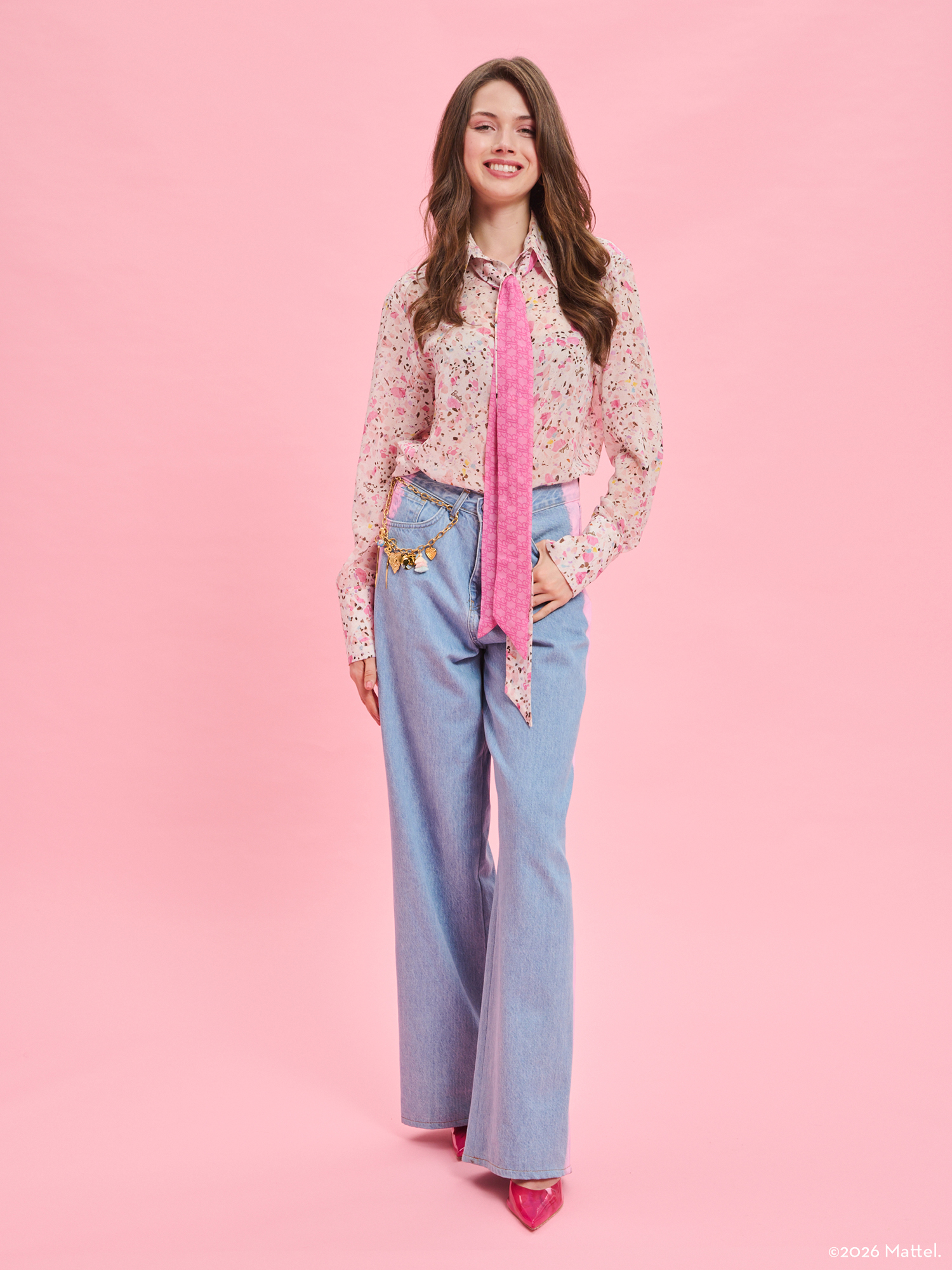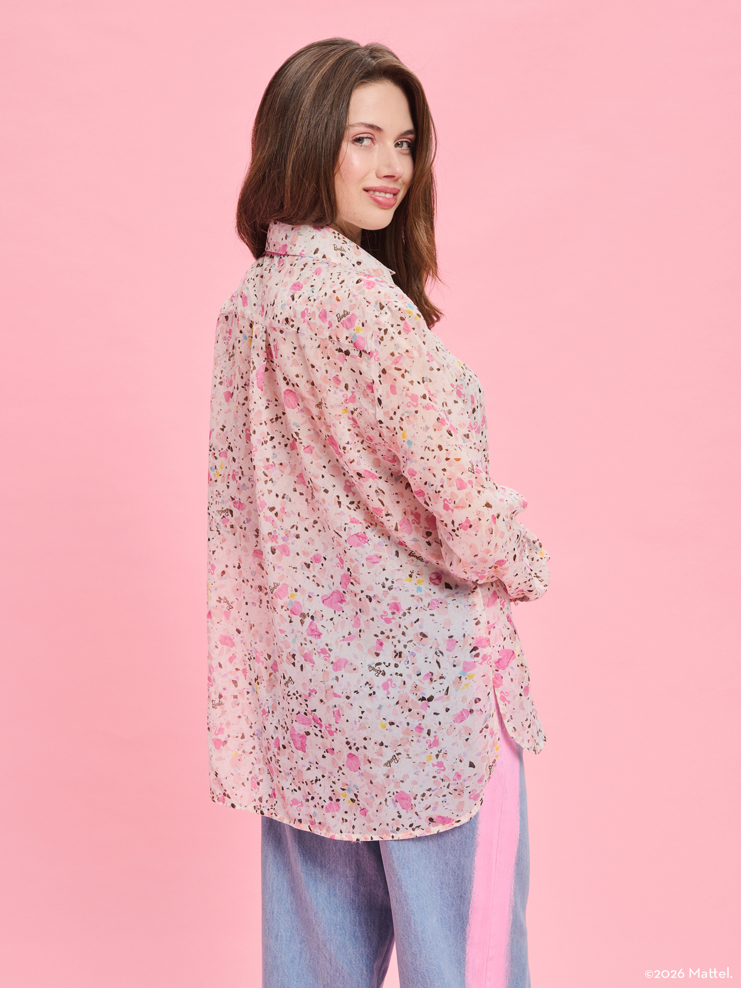 Το Barbie X Project Soma Strong Shirt κατασκευάζεται από silky touch μουσελίνα. Αέρινο πουκάμισο με ιδιαίτερο τύπωμα σε ίσια γραμμή με διπλή αποσπώμενη γραβάτα.